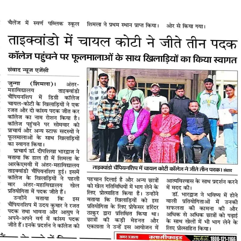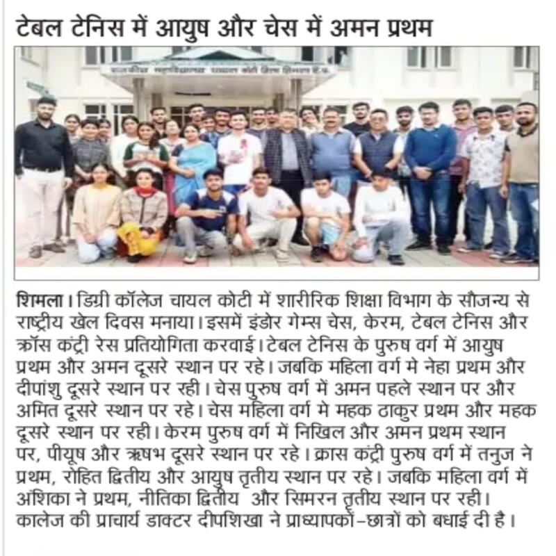 The Department of Physical Education at Government Degree College Chail-Koti, established in 2015, plays a vital role in promoting physical fitness, sports participation, and holistic development among students by integrating structured physical activities with scientific sports education. The department aims to nurture disciplined, confident, and health-conscious individuals through quality instruction, practical training, and values-driven sports programs. It offers a range of academic components including Discipline-Specific Courses, Skill Enhancement Courses, and Generic Elective courses, supported by hands on training in athletics, team games, martial arts, fitness modules, and wellness practices. With qualified faculty, the department provides essential sports facilities including outdoor playgrounds, indoor activity areas, and fitness equipment that support both academic and competitive sports development. The department regularly conducts intramural competitions, annual sports meets, coaching camps, and inter-college participation, while also organizing fitness awareness initiatives and community outreach activities in collaboration with local institutions. It encourages sports sciences, sports psychology, training methodologies, and performance enhancement. Looking ahead, the department plans to upgrade and expand sports infrastructure, establish a modern fitness center, and enhance student opportunities and promote a strong sports culture within the college.